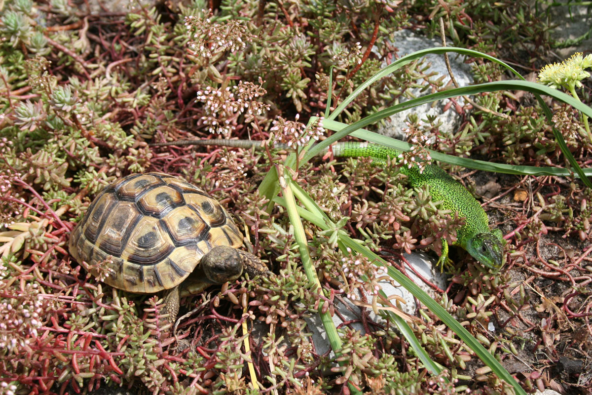 Op dit moment wordt mijn tuin bevolkt door 6 smaragdhagedissen, 7 Griekse landschildpadden, 1 paartje Koreaanse vuurbuikjes, enkele groene padden en een onbekend aantal Italiaanse kamsalamanders. Een vijver in de tuin levert natuurlijk meerdere voordelen. Naast leefruimte voor amfibieën, trekt een goed begroeide vijver en oevers veel extra insecten, zoals zweefvliegen, waterjuffers en libellen en hun larven. In mijn vijver is nog nooit een hagedis verdronken, hoewel er soms een dier in het water terecht komt na een snelle achtervolging door de tuin. Het is wel zaak op te letten met landschildpadden en een tuinvijver; zij kunnen wel degelijk verdrinken! Zorg er voor dat ze de vijver niet kunnen bereiken, of zorg voor zeer makkelijk begaanbare oevers aan alle kanten van de vijver zodat te water geraakte dieren weer op de oever kunnen klauteren.
