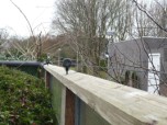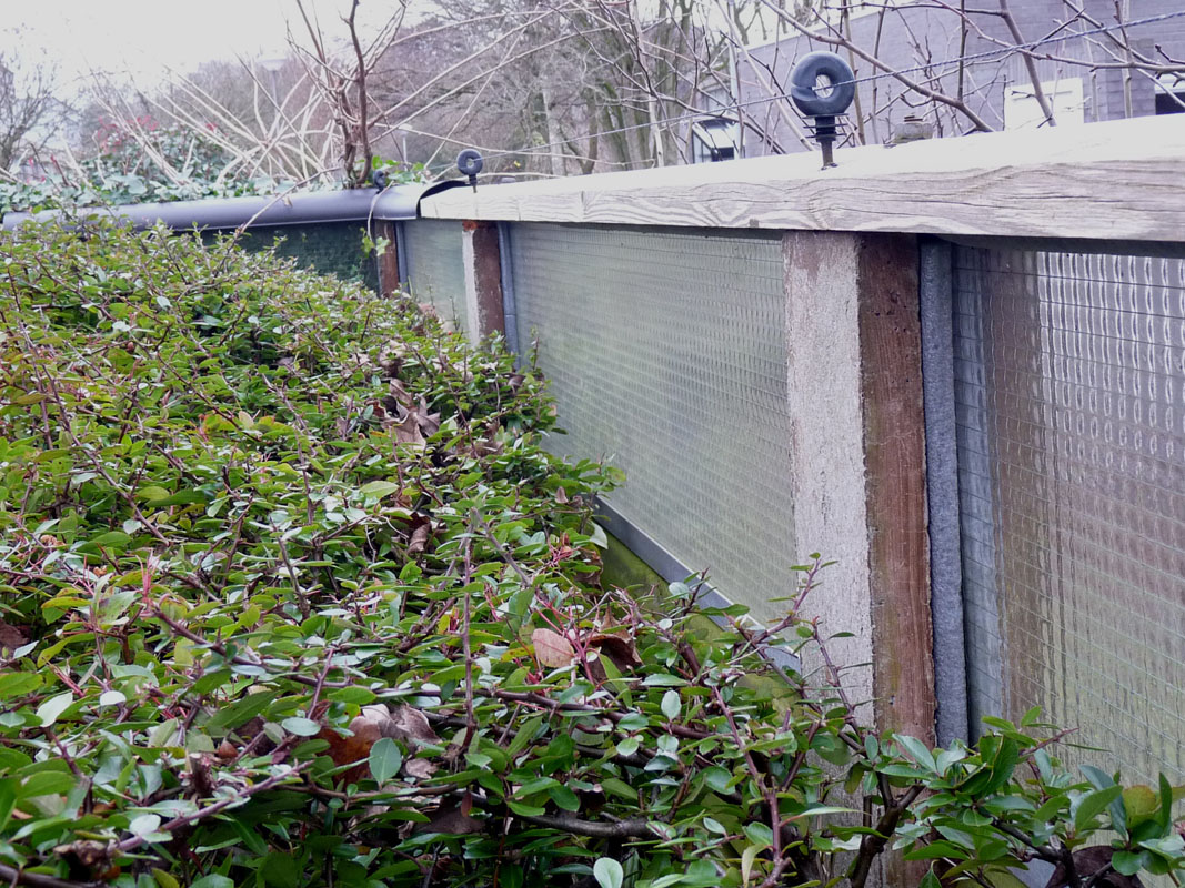 De eerste vraag is vaak: "Heb je dan geen lst van buurtkatten of eksters en kraaien?" Zeker, in mijn buurt komen eksters en kraaien voor en regelmatig zie ik ze in de tuin, echter ze hebben nog geen enkel slachtoffer gemaakt. Goeddeels kan ik dat verklaren door de gedragsverandering van de hagedissen wanneer ze in de tuin losgelaten worden. Bij iedere plotselinge beweging 'schieten' ze weg, dus ook als er plotseling een vogel over vliegt of landt in hun buurt. Ook reigers heb ik soms in de tuin, maar ik mis nog steeds geen dieren. De katten vormden in het begin wel een gevaar. Naar aanleiding hiervan heb ik heb op enkele centimeters boven de schutting en muur schrikdraad gespannen (zie foto) en nadien heb ik nooit meer een kat gezien. Kortom; een goede oplossing die ik iedereen kan aanbevelen. (zie ook Lacerta 49: 149-150) Ik heb in de afgelopen jaren ook muizen in de tuin in een muizenval gevangen. Denk er wel aan wanneer je muizenvallen zet dat de hagedissen of andere tuinbewoners geen gevaar lopen! Spitsmuizen zouden tijdens de winterslaap wel een gevaar voor onze dieren kunnen vormen. Zelf heb ik die ervaring niet. Omdat de schutting bijna een meter diep in de grond staat kunnen ook mollen mijn tuin niet in.