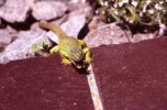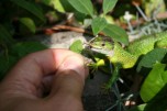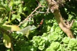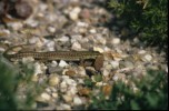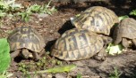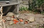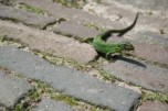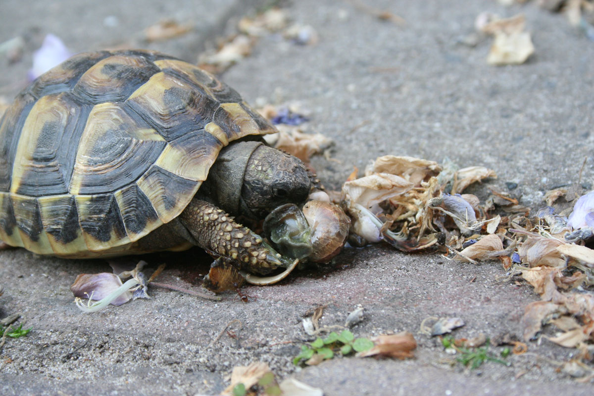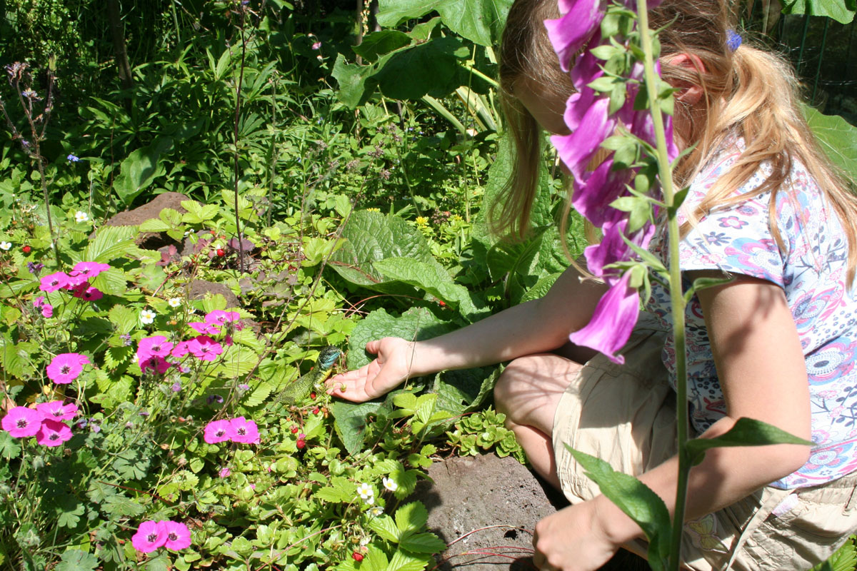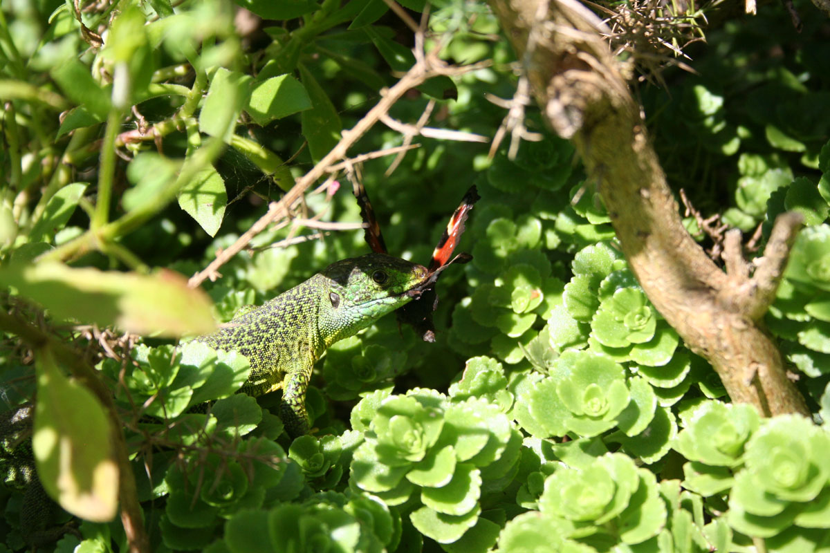Iedere ochtend nadat de hagedissen zijn opgewarmd in de zon, gaan ze op zoek naar voedsel. Ze klimmen tot boven in de struiken en snuffelen onderwijl zorgvuldig onder alle blaadjes om motjes of spinnen te overmeesteren. Ook onder dode bladeren, tussen de tegels van het terras, tussen het tuingereedschap en onder de vensterbanken wordt intensief gezocht. Als er een prooi gevonden is dient deze snel verorberd te worden, want het afpakken van elkaars prooi is een populaire bezigheid. Tijdens dit fourageren likken ze ook dauwdruppels van de bladeren. Natuurlijk verschaft niet elke tuin dezelfde hoeveelheid voedsel. In een nieuw ingerichte tuin moet het insectenleven nog op gang komen en is (bij)voeren noodzakelijk. We kunnen de zaak snel op gang helpen door de tuin te beplanten met veel inheemse bloemen en planten zoals wilde cichorei, toortsen, papavers, koninginnekruid, kattestaarten enz. zullen we veel insecten aantrekken. Ook allerlei kruiden als lavendel, tijm, rozemarijn maar vooral wilde marjolein, trekken veel insecten aan. Ook een vijver met oeverbegroeiing, een flinke laag afgevallen blad onder de struiken en een stapeltje dood hout zullen zorgen voor een goed voedselaanbod. Last but not least: een composthoop vormt het summum van voedselaanbod. Indien goed aangelegd, is deze reukvrij en bevat een enorme hoeveelheid pissebedden, wormen, kevers, slakjes enz. Hoe je een composthoop aanlegt vind je in elk tuinboek. Zelf heb ik vier palen in de grond geslagen, elk op 1,5 meter afstand en daartussen zeer grof gaas gespannen zodat de hagedissen door het gaas kunnen klimmen en zo eenvoudig de hoop in kunnen. Elke dag zijn er wel één of meerdere hagedissen (of padden) actief op of in deze composthoop. De dieren in de tuin blijken ook allerlei voedsel te eten die voorheen in het binnenterrarium werd geweigerd. Pissebedden, huisjesslakken, loopkevers en harige rupsen bijvoorbeeld. Parelhagedissen pakken regelmatig dikke hommels uit de bloeiende tijm en Rosemarijn en verslinden ook alle slakken, met en zonder huisje. Parelhagedissen moeten wel regelmatig worden bijgevoerd met bijvoorbeeld treksprinkhanen en moriowormen. De groene padden (Bufo viridis) voer ik soms tijdens zomeravonden als ze jagen op het terras. Ook zij wennen snel aan vaste voederplaatsen. Uiteraard moeten Schildpadden (Testudo hermanni) iedere dag gevoerd worden met allerlei soorten groenten en kruiden. Ze lopen bij mij in een afgesloten deel van de tuin waar ze in ieder geval niet van de tijm, lavendel en rozemarijn eten. Enkele keren per jaar voer ik gedroogde kattenbrokjes en dan eten de smaragdhagedissen gezellig mee! (zie foto)