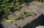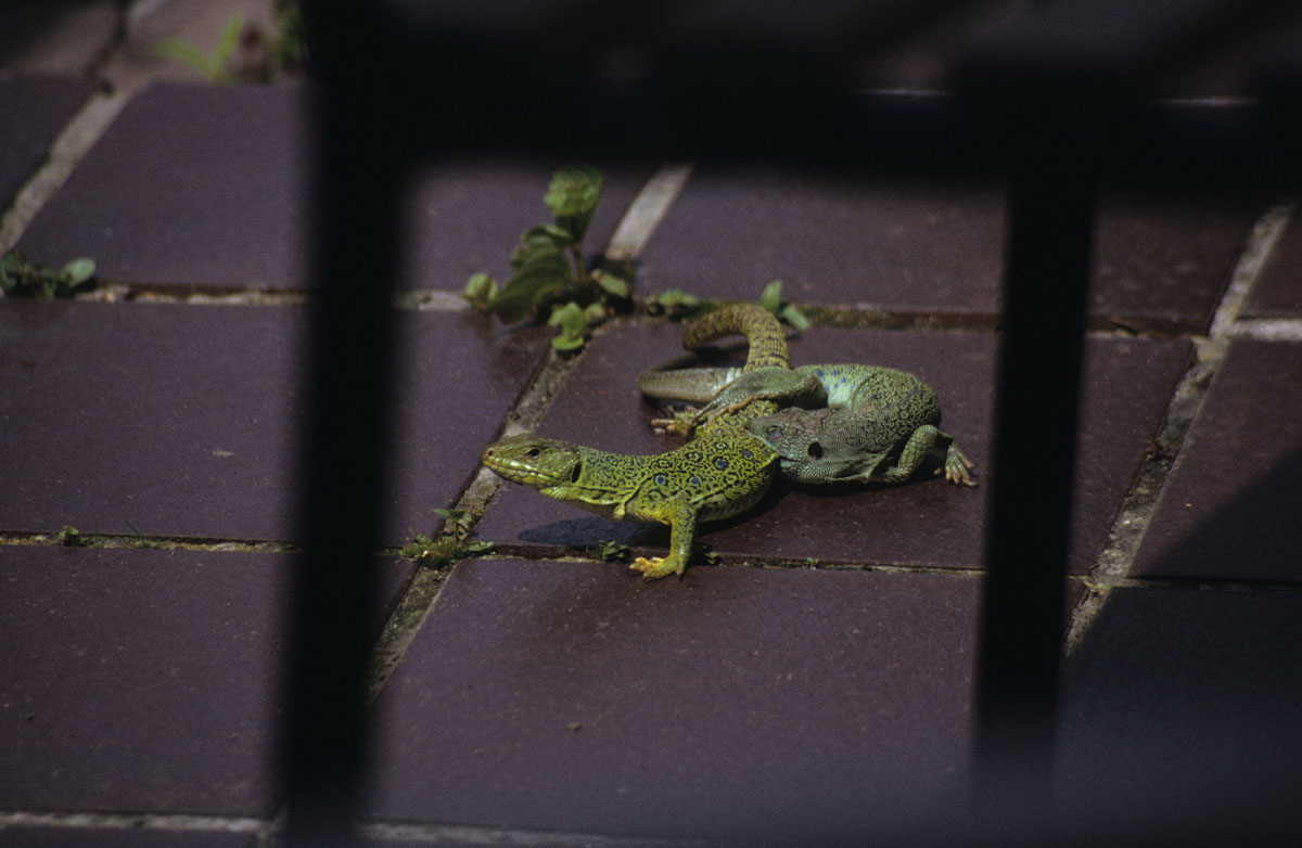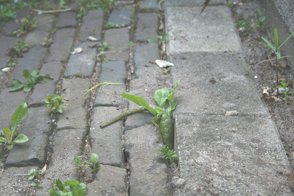 Een belangrijke voorwaarde, wanneer de dieren door de tuin lopen, zijn voldoende geschikte ei-afzetplaatsen. De smaragdhagedissen in mijn tuin ontwaken in maart, de mannetjes soms al eind februari, bij zeer zacht weer. Dat hangt af van de temperatuur in hun overwinteringsplaats. De eerste dieren worden actief wanneer de grondtemperatuur de 10 graden bereikt. Het mannetje altijd eerder dan de wijfjes. Copulaties worden gezien vanaf half april. Ieder jaar hebben de wijfjes rond 1 juni hun eitjes afgezet in de tuin. Meestal gebruiken ze een zanderig en gemakkelijk te graven deel dat bijna de hele dag in de zon ligt, maar ook gebruiken ze bloempotten die zijn ingegraven in de volle zon. Voor alle plaatsen geldt: enigszins vochtig, makkelijk te graven en vrijwel de hele dag op de zon ge-exposeerd. Het afzetten van de eitjes vind bijna altijd plaats vlak na zonsondergang. De hoogzwangere wijfjes zie ik elk jaar her en der in de tuin "proefboringen" verrichten. Aangezien het aantal geschikte eiafzetplaatsen beperkt is door dichte begroeiing, verharding of schaduw, kost het weinig moeite om jaarlijks de legsels terug te vinden. Regelmatig graaft een wijfje onder een terrastegel om haar legsel af te zetten (zie foto’s).