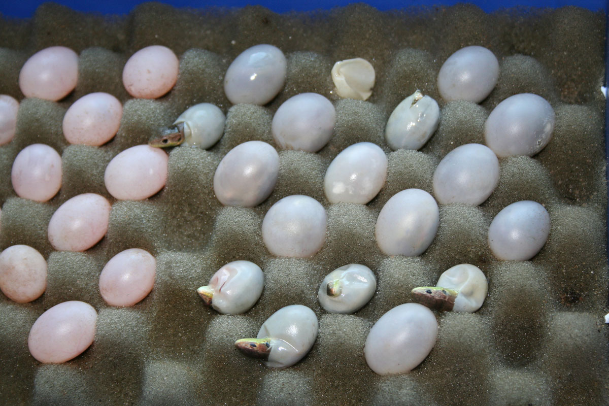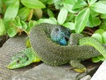 De eitjes graaf ik op en plaats ze in een stoofje bij ongeveer 24 graden, na ruim 50 dagen kruipen de jongen uit het ei. In mijn tuin zorgt elk volwassen smaragdhagedissenwijfje jaarlijks voor een legsel van 12 tot 19 eitjes. Het uitvangen van een hoogzwanger wijfje om de eitjes te verzamelen is geen goede optie, het levert veel stress op en verlies van de eitjes; nooit doen! Een hoogzwanger wijfje nieuw in de tuin zetten raad ik sterk af, ze hebben ruim tijd nodig om een geschikte ei-afzetplaats te vinden.
